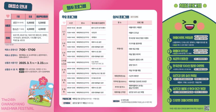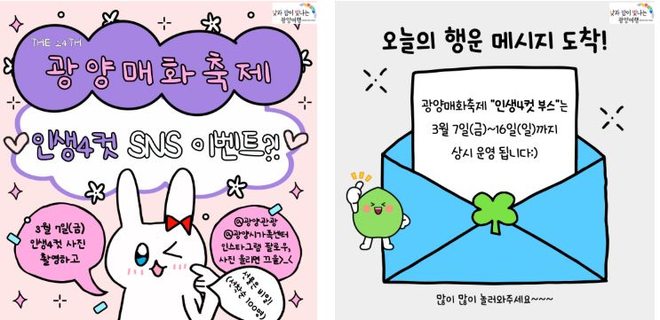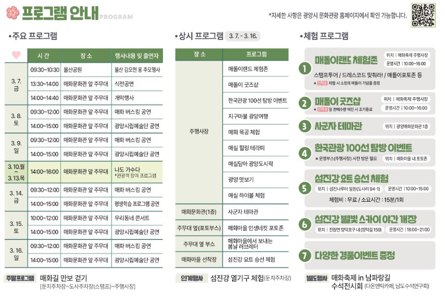 올해 24회를 맞이하는 광양 매화축제는 사군자 테마관을 운영,여러가지 체험, 굿즈 등 여러가지 프로그램으로 축제가 열리고 있다고 하는데요~ 실제로 찾아보니 정말 많은 체험들이 있더라구요.