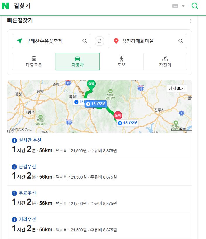 구례 산수유꽃축제장과 광양 매화축제장의 거리는 1시간내외로
